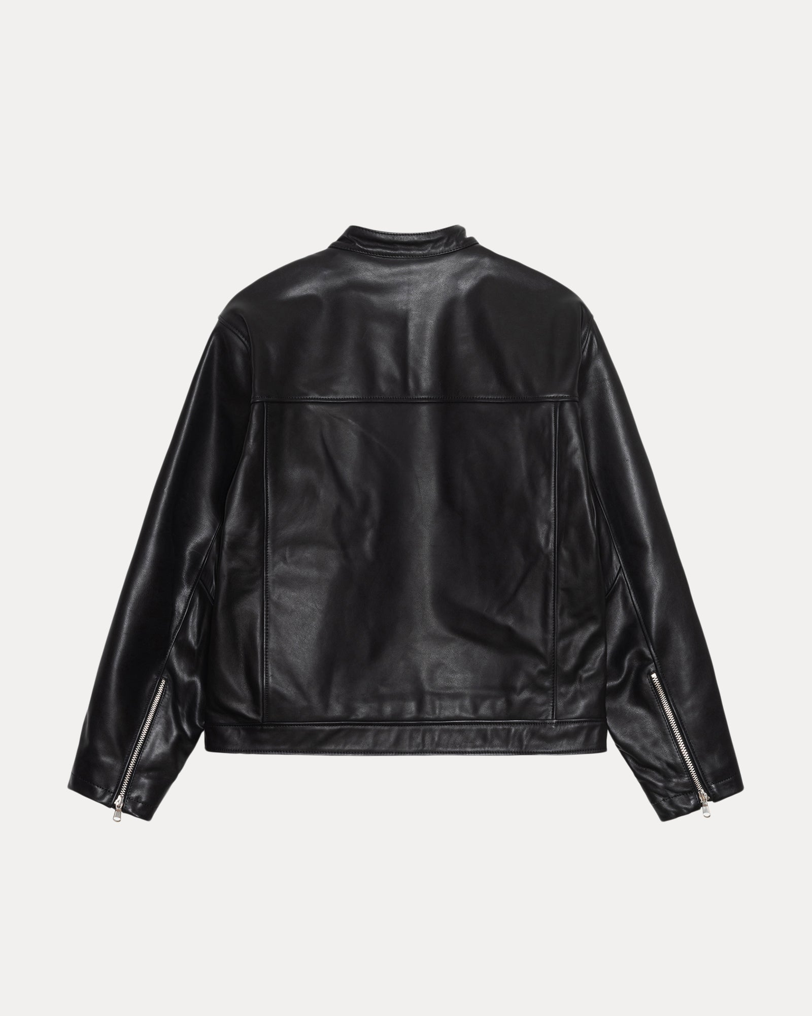 Classic fit racer jacket in heavy weight leather. Features an articulated sleeve and quilted lining.