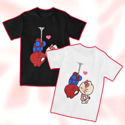 Featuring Hello Kitty and Spider-Man in a sweet heart-shaped web graphic, this tee blends kawaii charm with Marvel magic. Ideal for Marvel fans, Hello Kitty collectors, and couples who love a playful twist.