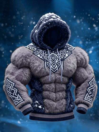 Men's Viking Tribal Jacquard Celtic Inspired Muscle Line Art Plush Warm Hoodie