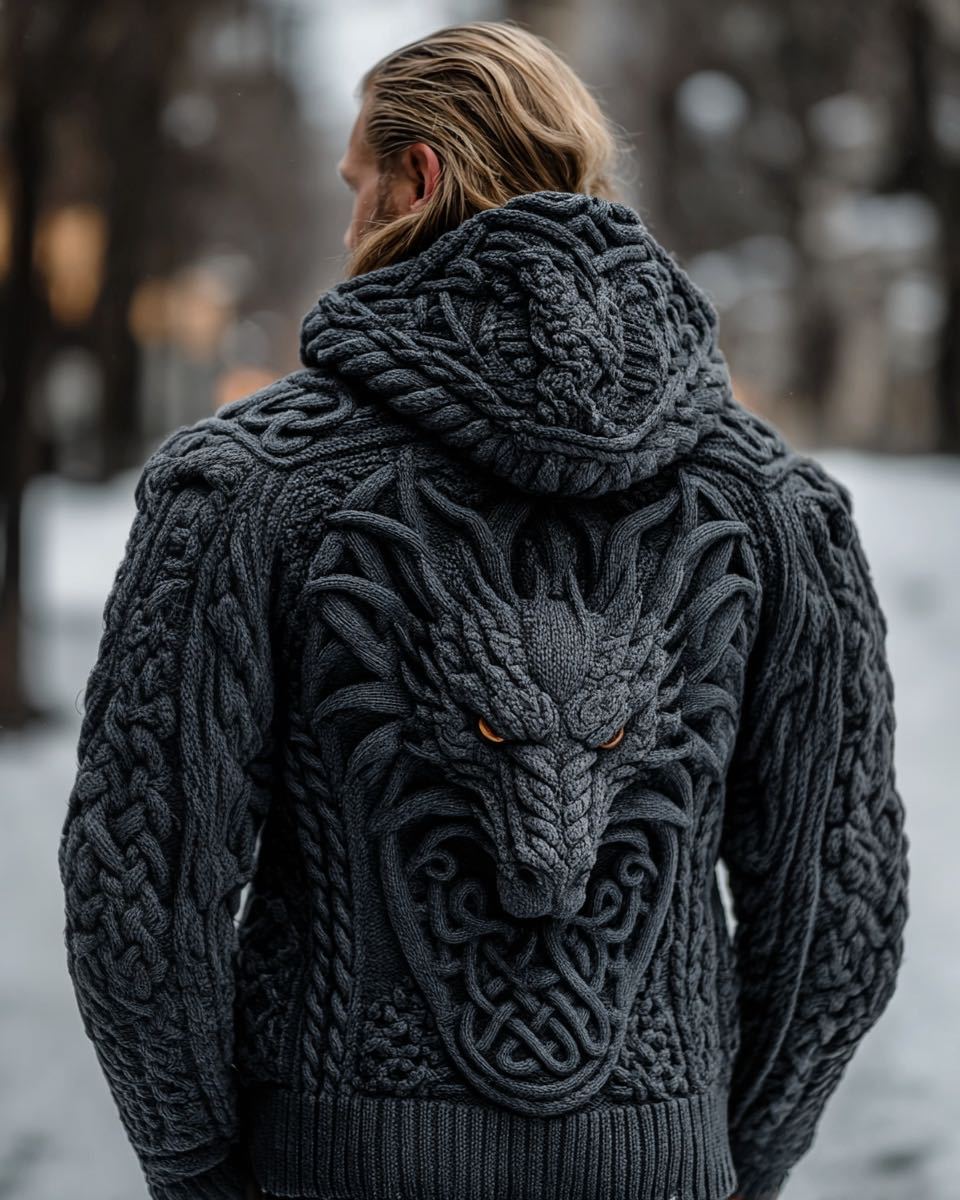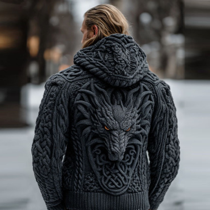 Men's Vintage Viking Dragon Style Celtic Knot Art Chunky Knit Hooded Zip-up Sweater