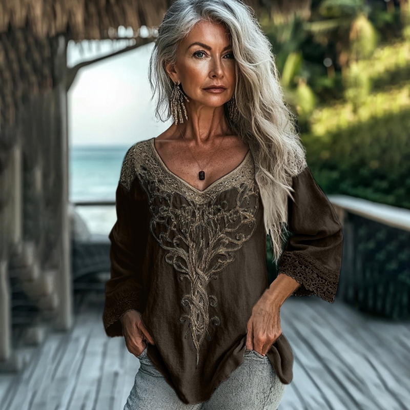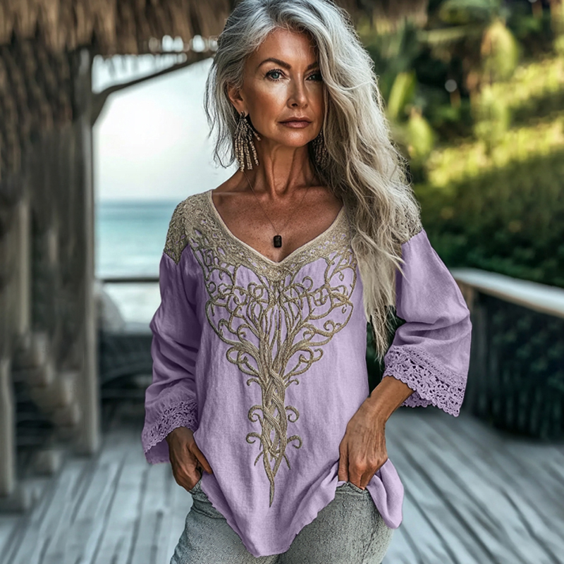 Women's Vintage Tribal Celtic Knot Lace V Neck Linen Shirt