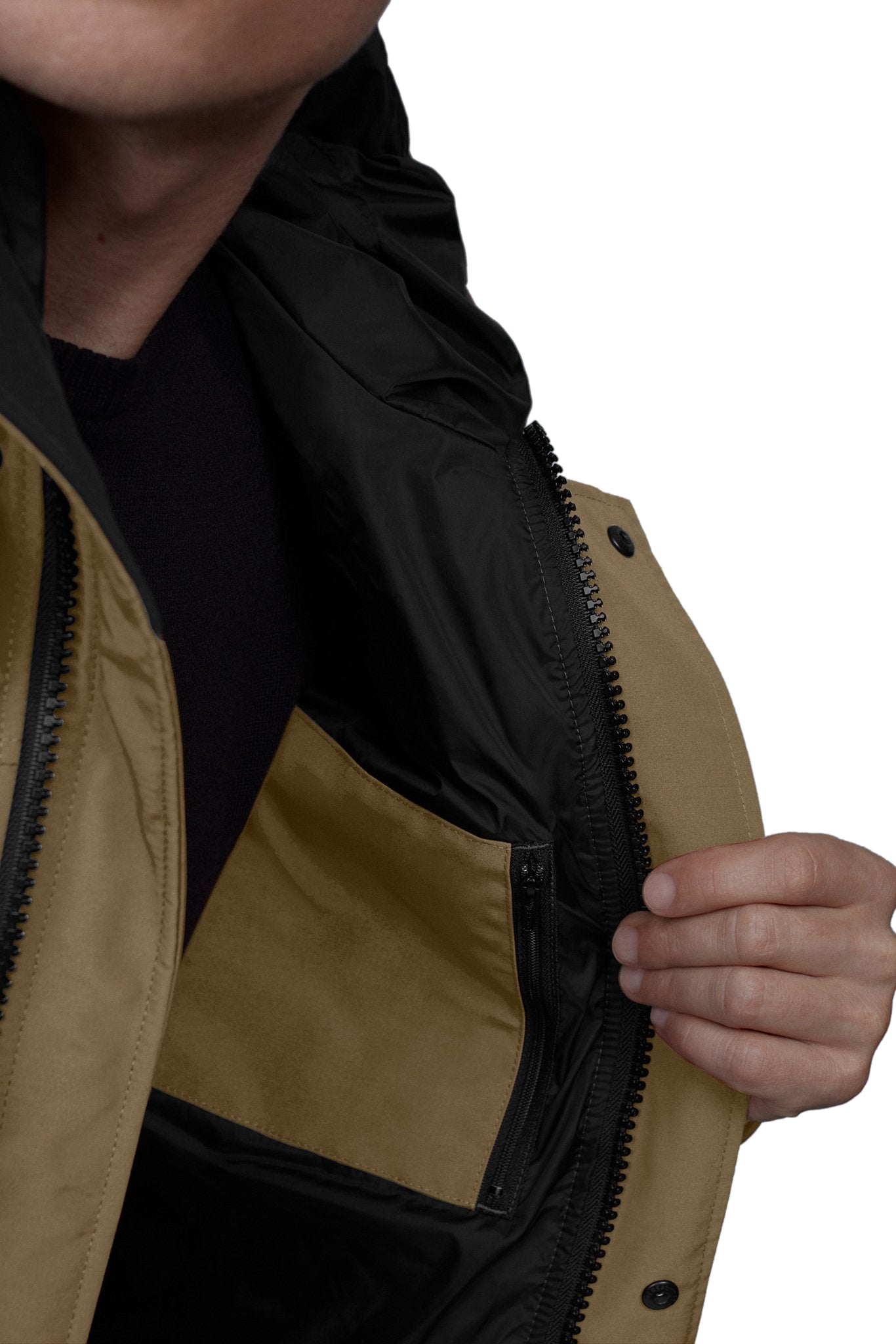 • La patte avec fermeture à boutons-pression recouvrant la fermeture éclair à double sens vous protège des éléments extérieurs. Ouvrir la fermeture éclair à partir du bas pour accroître l’amplitude des mouvements ou vous aérer