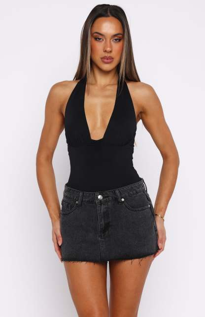 Short but sweet! The Broken Trust Denim Mini Skirt in Black features belt loops, a front button and zipper closure, and a five-pocket design. The frayed hem adds a touch of casual flair, while the unlined interior ensures comfort. Finished with a faux leather White Fox label on the side back. Style with a black tank and boots for a chic look!