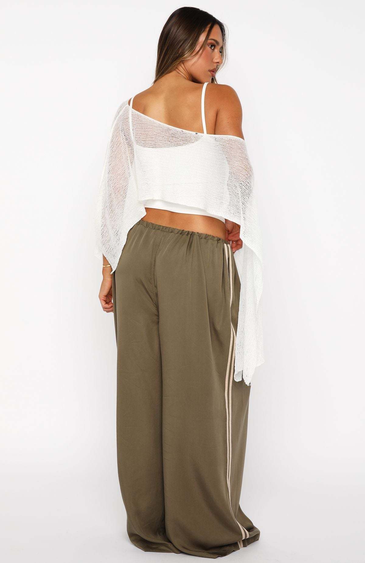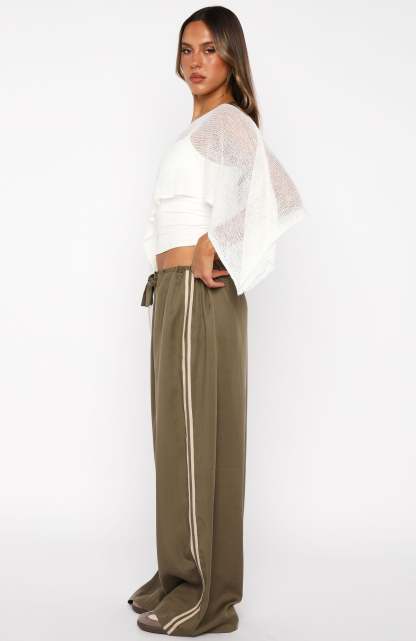 Escape into weekend festivals. The Distant Memories Pants in Khaki marry a slim drawstring waist with a relaxed wide-leg silhouette in lightweight, unlined fabric. A subtle double-stripe detail down each side injects a hint of boho chic. Pair with a basic tank and the Beach Therapy Knit Poncho Top for a whimsical but cool festival fit.