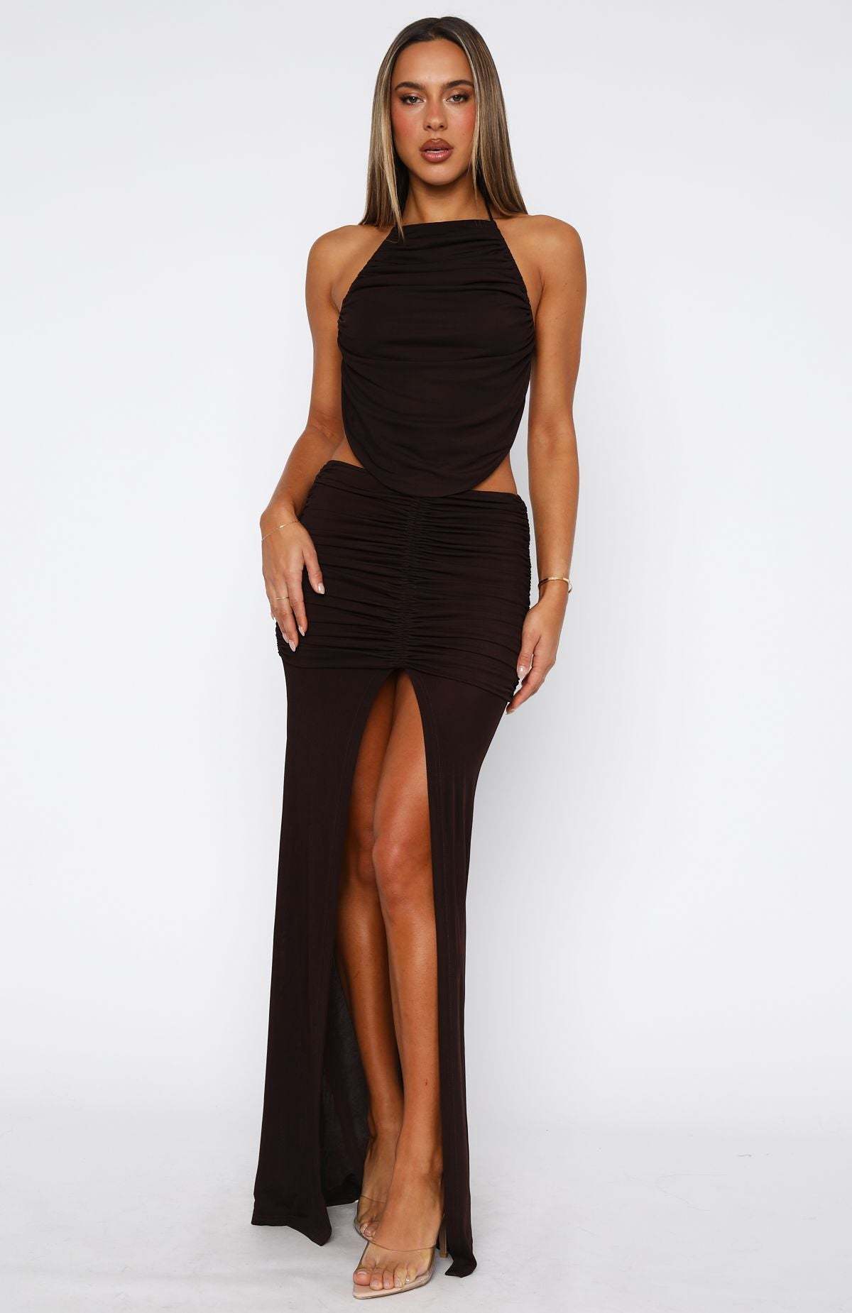 Create an everlasting impression in the Everlasting Midi Skirt in Chocolate! Features thin elasticated waistband, mini length is lined with ruched detailing and maxi length is sheer fabrication with front leg split. Feel your sexiest by pairing with the matching Everlasting Halter Top in Chocolate.