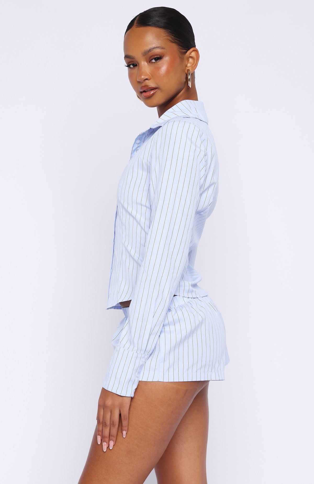 Office siren mode: activated. The Heatwave Honey Shorts Sky Blue features a thick elastic waistband, relaxed fit, button front detailing and breezy, light-weight fabrication. It pairs perfectly with the matching Heatwave Honey Long Sleeve Shirt in Skye Blue for a boss-girl vibe.