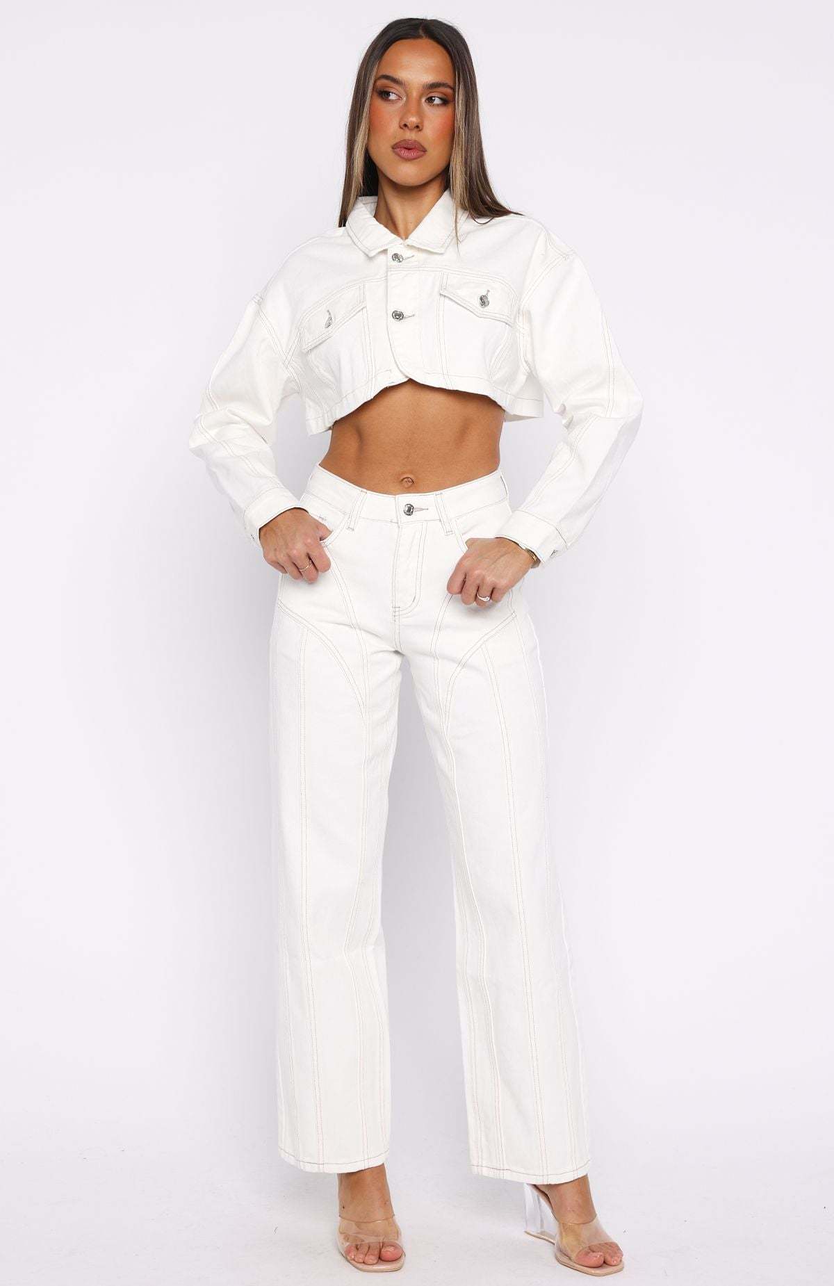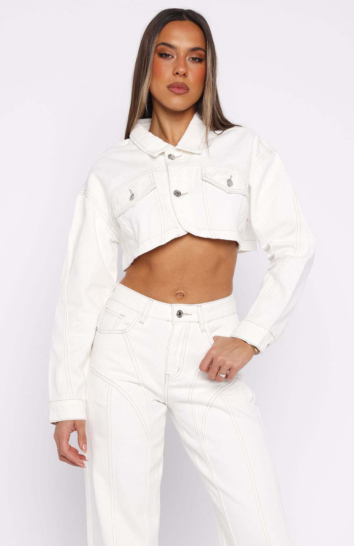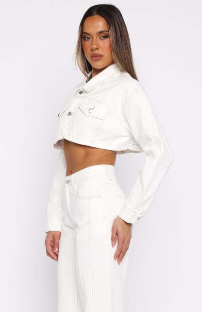 The weekend is here and it's time to celebrate with the Love You Again Denim Jacket in Off White. This jacket is a cropped fit and features collared neckline, front button closure, cuff button closure, front pockets and rounded hem. Complete the look with the matching Did You Miss Me Denim Jeans and your go-to gold accessories!