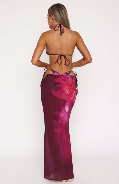 Whether it's cocktail hour under the summer sun or an insta photoshoot, the Luminous Maxi Skirt Berry Lush will soon be your go-to. Features a maxi length, cut-out waist design, side self-tie straps, unlined fabric and an easy slip on style. Pair with cool shades and gold accessories for a complete look.