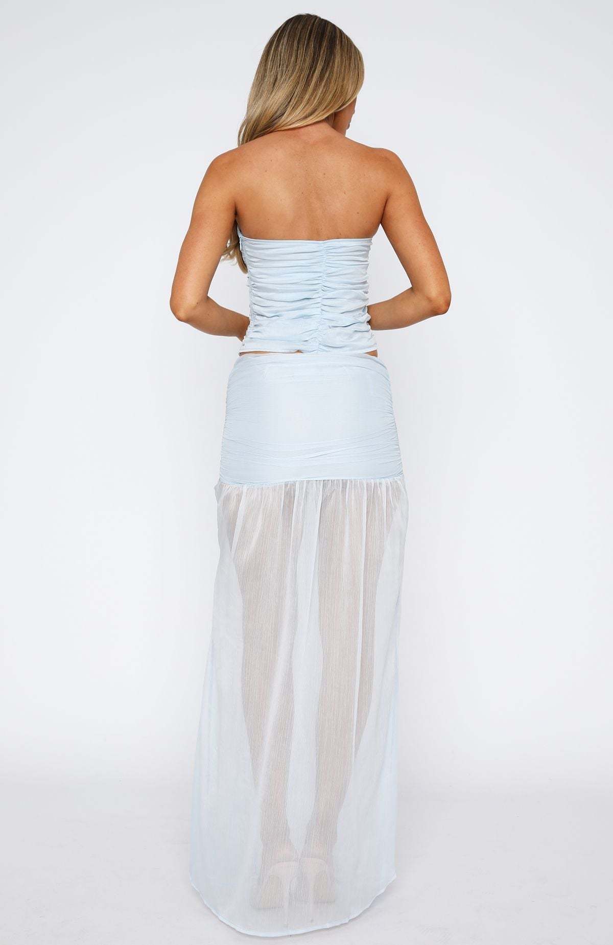 The On Stage Maxi Skirt Sky is your go-to for nights that call for a little extra glam! Featuring a thin waistband with invisible side zipper and clasp closure that can be worn low or mid waisted, side ruched detailing, partially lined, and high side split detailing. Style with the On Stage Strapless Top for a matching moment we adore!