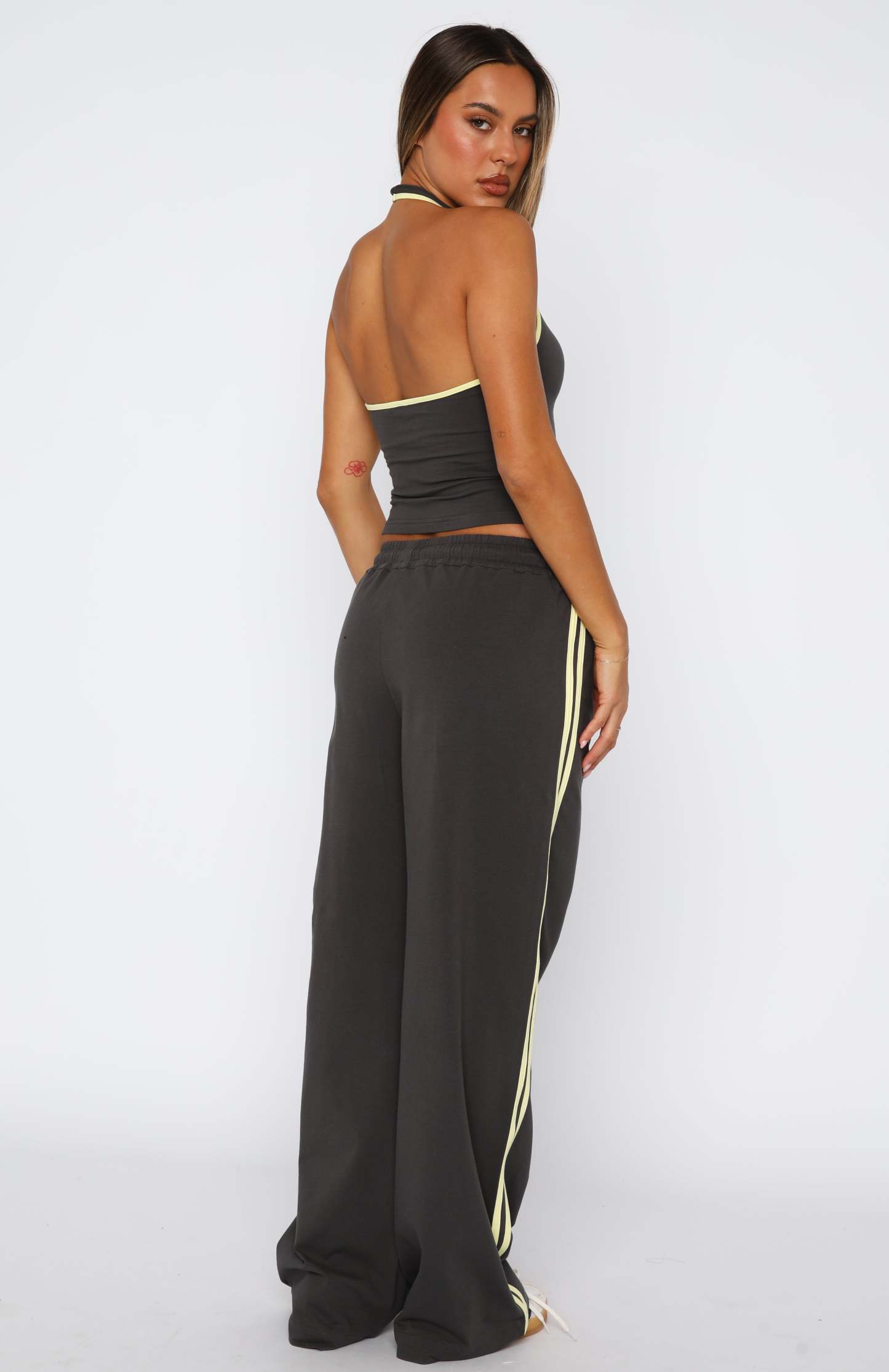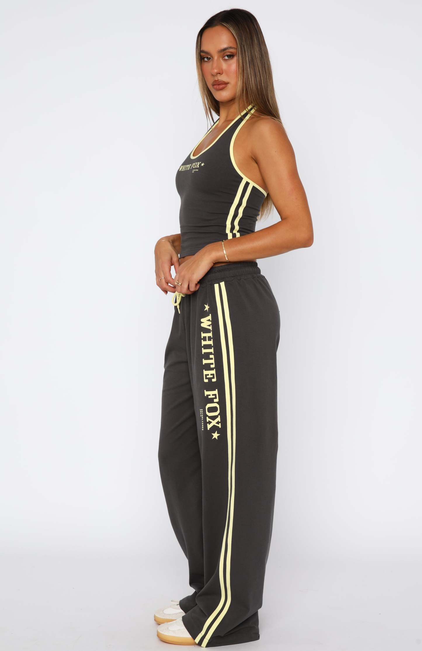 This colour combo makes casual look instantly cool! Star Of The Night Track Pants in Charcoal features thick elasticated waistband with yellow drawstring ties, wide leg with yellow panel fabrication on side and White Fox text side front. Have a five star quality fit by pairing with the matching Star Of The Night Top in Charcoal.