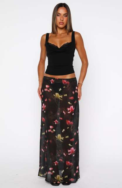 Elevate your look with a hint of Parisian grace. The Sunday Strolls Maxi Skirt Lace And Bloom features a sleek fixed waistband, flowing A‑line silhouette, sheer draped fabrication, and a discreet side zipper with hook‑and‑eye closure for a clean finish. Style with the Rose Days Top and simple flats for an effortless look.