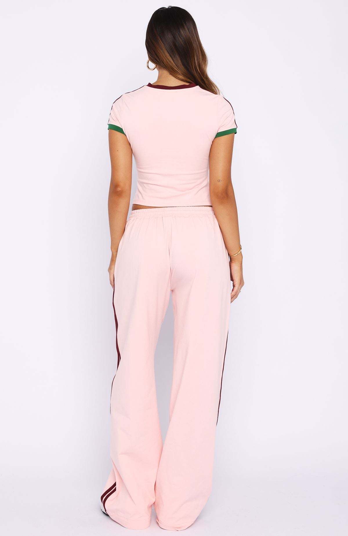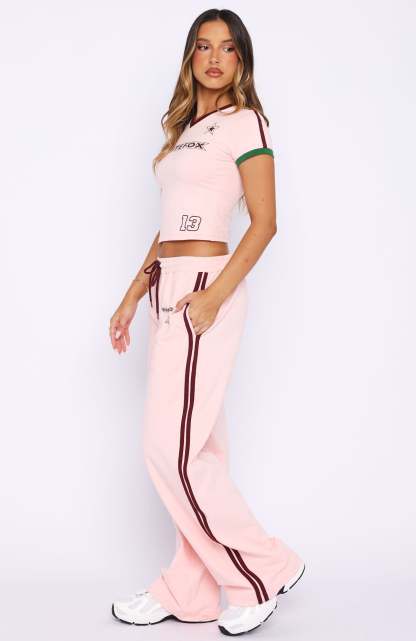The Too Chill Track Pants Pink nails the street style look with a touch of cute. Featuring a thick elastic waistband with contrast drawstring, easy‑care wide‑leg cut, and on‑trend double side‑stripes. Side pockets add everyday practicality, and the unlined, high‑stretch fabric keeps things breezy. Pair with the matching Too Chill Baby Tee Pink!