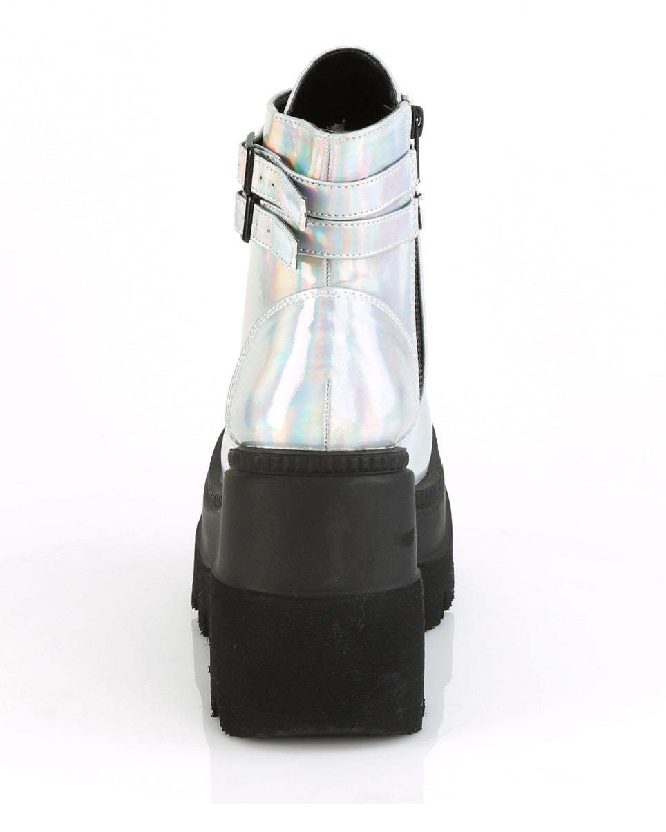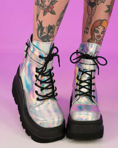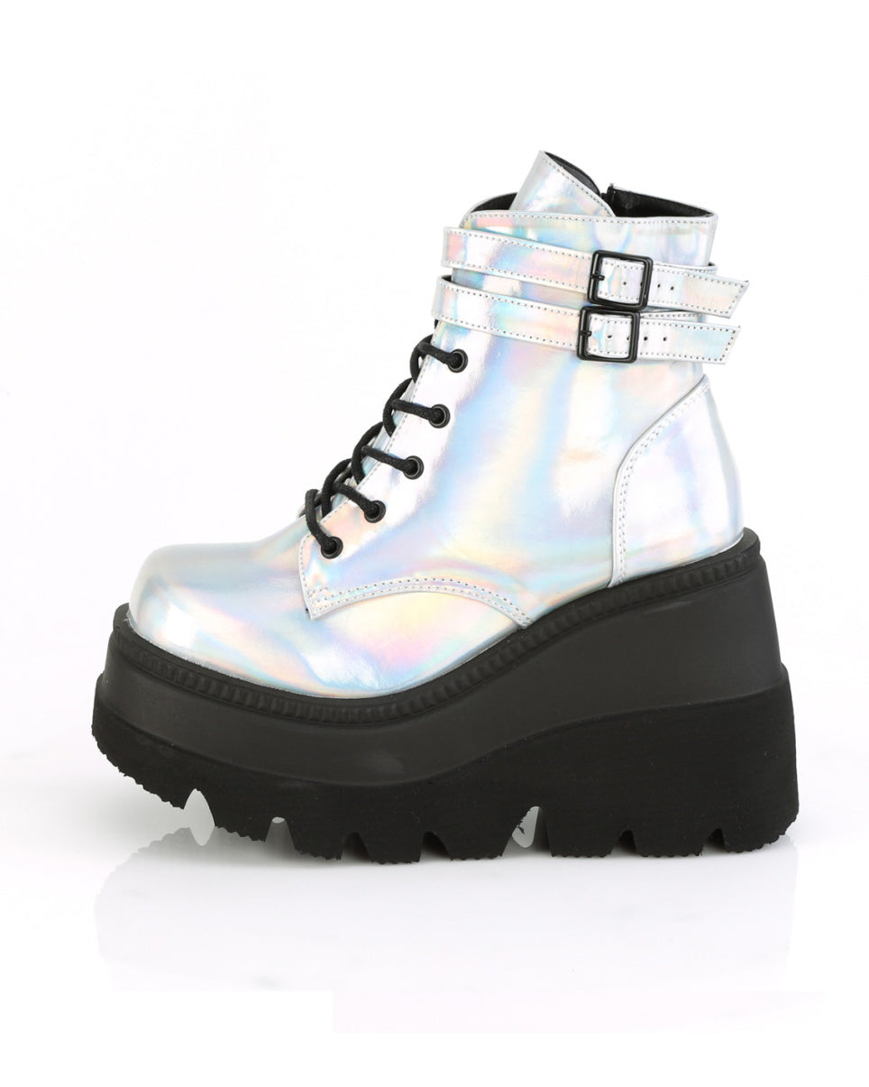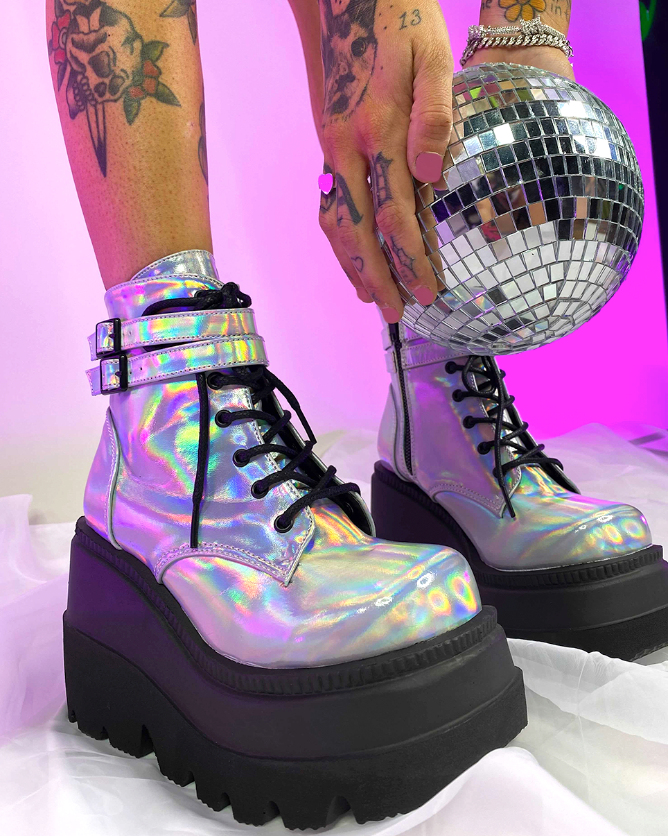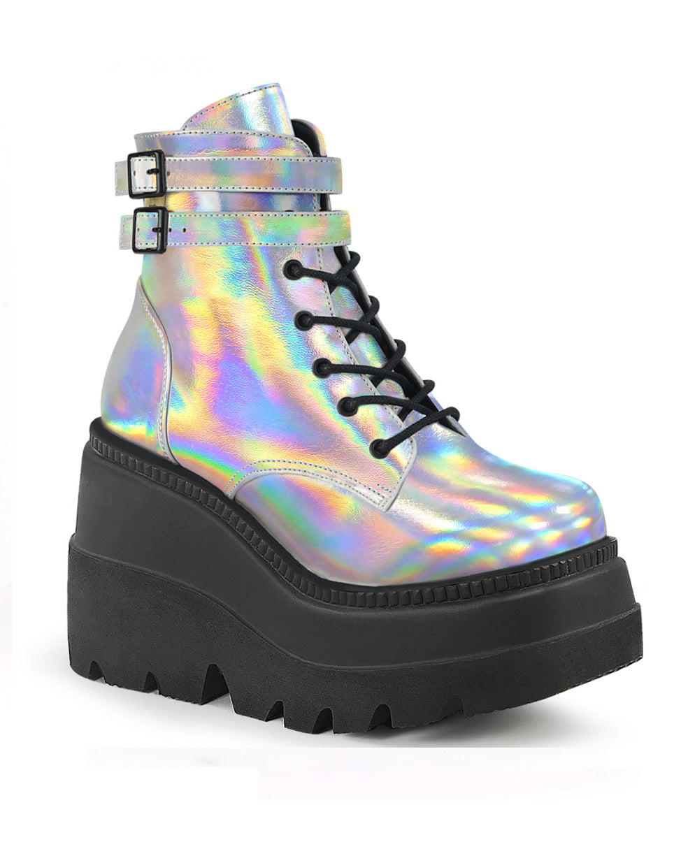 4 1/2" (114mm) Tiered Platform Lace-Up Front Ankle Boot Featuring Double Grommet Buckle Straps, Inside Zip Closure