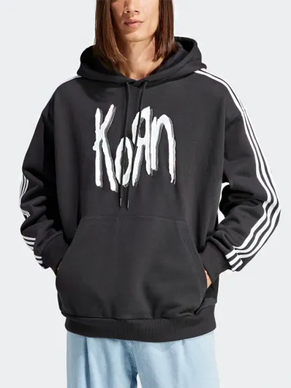 Drenched in black, the hoodie radiates a timeless, classic vibe that’s synonymous with both Adidas’ iconic style and Korn’s edgy musical persona. It’s perfect for those who appreciate minimalist fashion with a rockstar twist.