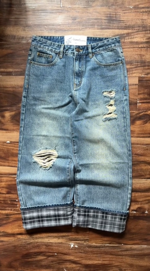 PLAID‑LINED DISTRESSED JEANS
