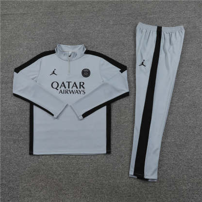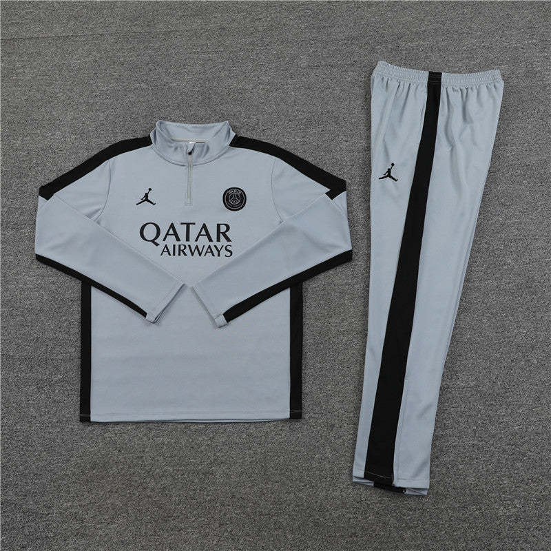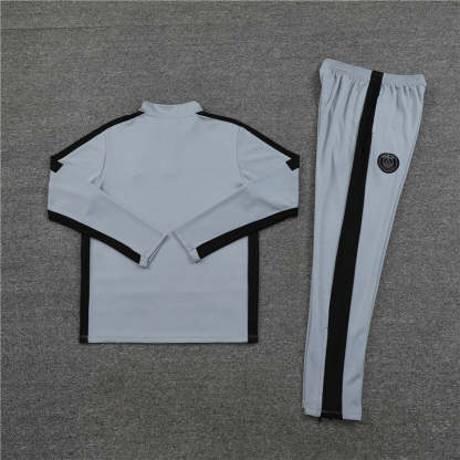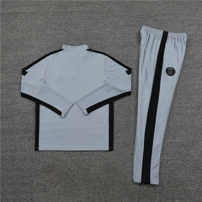 The Paris Saint-Germain Grey and Black Tracksuit delivers a sleek, modern look with a strong urban edge. Made from lightweight, breathable fabric, it ensures maximum comfort for both training and casual wear. The stylish grey base combined with bold black accents creates a clean, powerful contrast. With a tailored fit and durable finish, this tracksuit is perfect for performance and everyday street style.