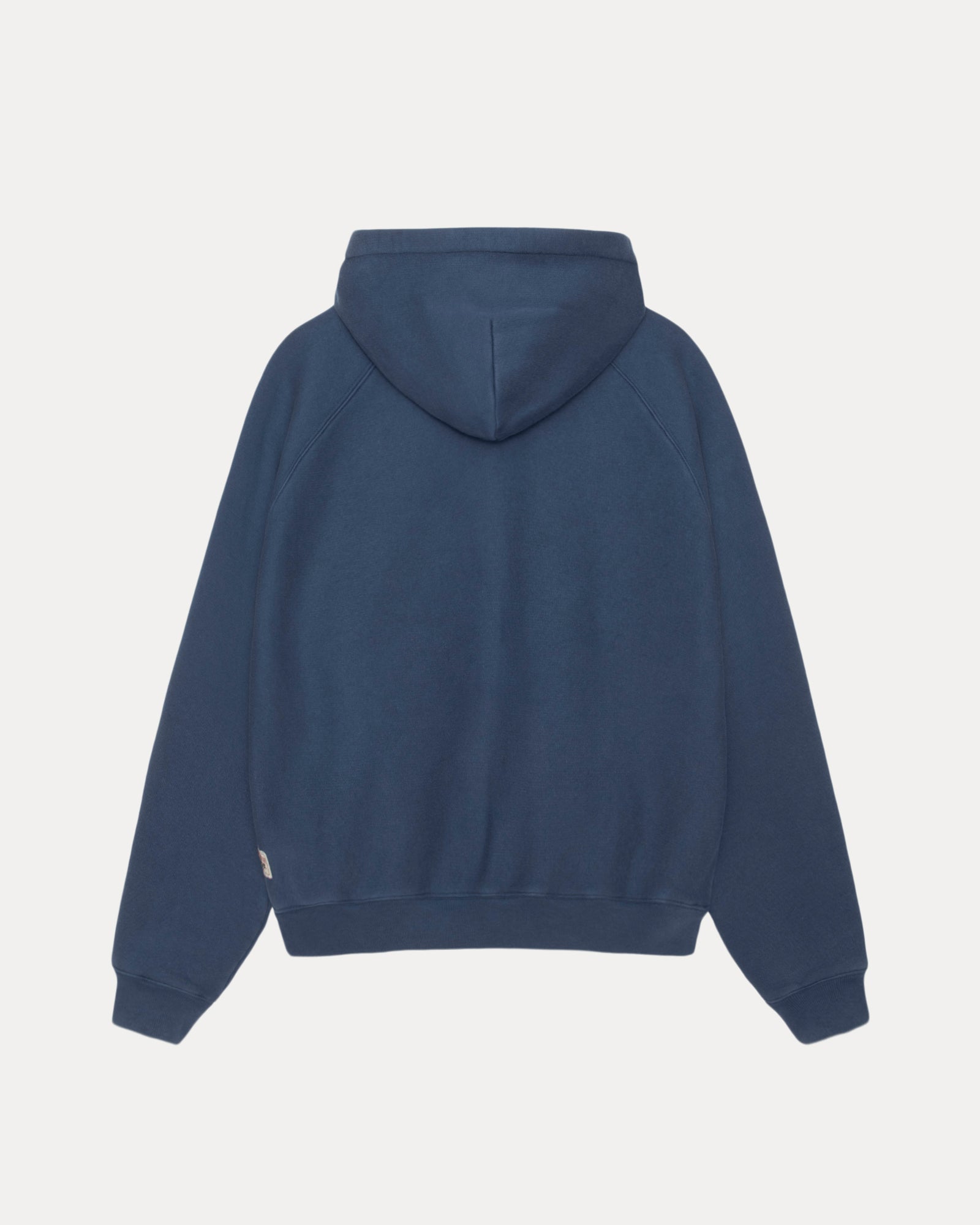 Relaxed zip-front hooded sweatshirt in a heavy 15.8oz cotton blend fleece. Stüssy authentic workgear label sewn at the side.