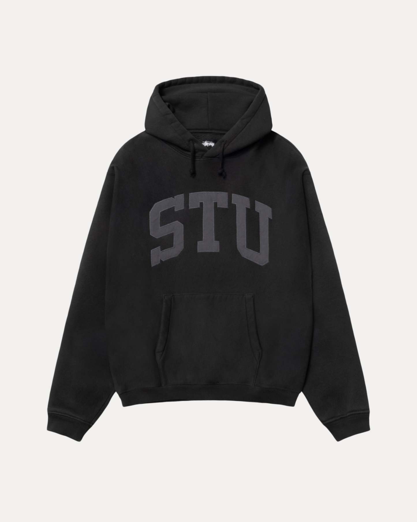 Oversized fleece hoodie in a heavyweight 500gsm cotton blend with a brushed interior. Boxy, slightly cropped fit with a twill STU arch logo applique across the chest.